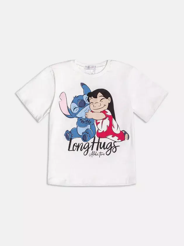 Para as pequenas que amam aventuras tropicais, essa blusa off white traz Lilo e Stitch em uma estampa que mistura carinho, diversão e muito estilo. O visual leve e o fundo neutro destacam os tons vibrantes do desenho, enquanto a modelagem soltinha garante liberdade e conforto para todos os momentos do dia.