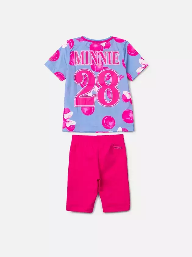 O conjunto infantil traz estampa de bolas de tênis no formato da personagem Minnie Mouse, unindo criatividade e estilo esportivo ao visual. Confeccionado em tecido leve de algodão, oferece frescor e conforto durante todo o dia. Ideal para produções criativas e casuais, traduz o espírito moderno e fashion da Animê.